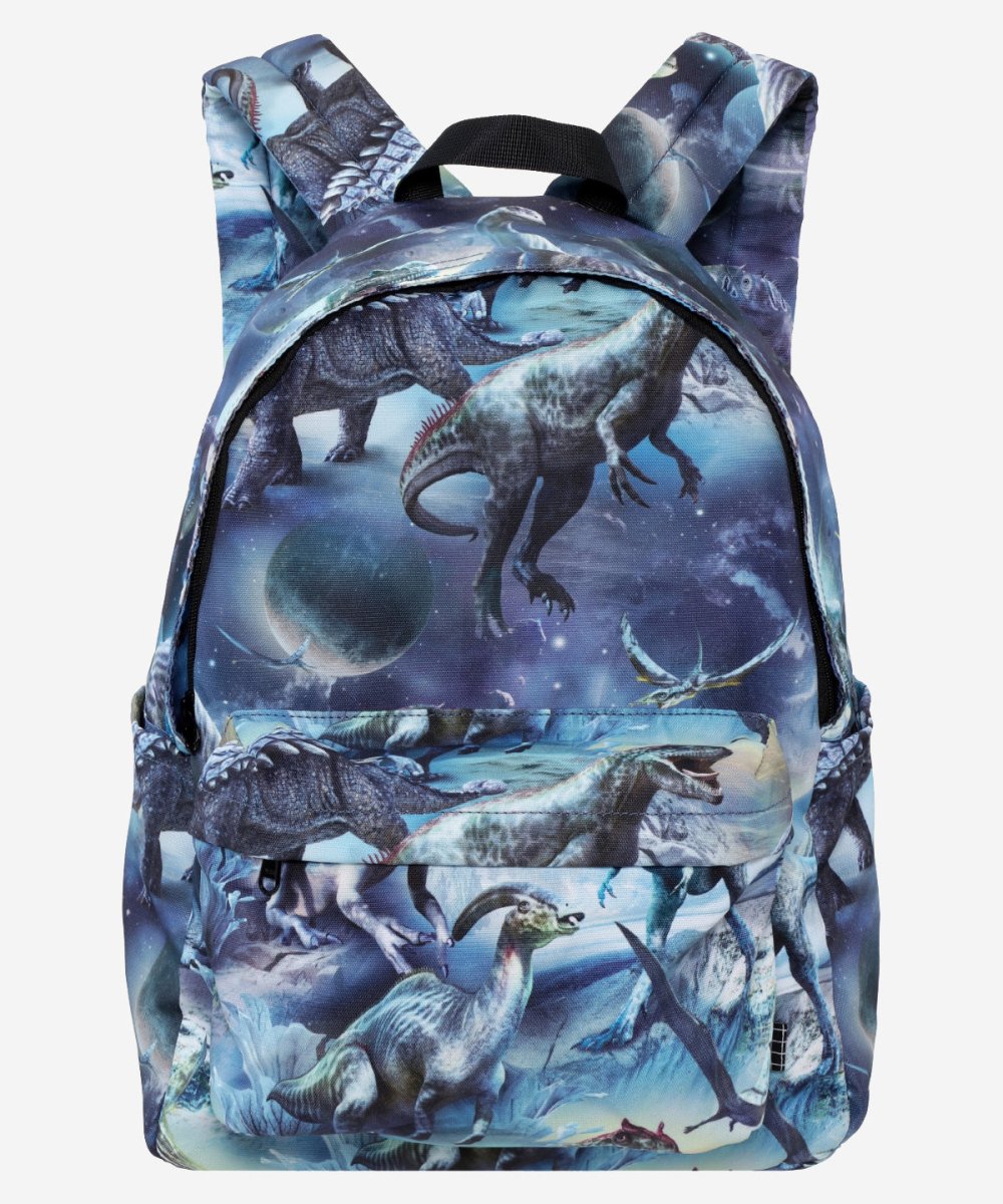 Details: Roomy rucksack with a all over print Dinoverse. It is made from recycled polyester. The rucksack has an exterior pocket on the front with a zipper and two side pockets that are great for, e.g. water bottles. It is padded and has adjustable shoulder straps as well as a loop. This Molo product is recycled and made from recycled polyester that comes from used plastic bottles and other waste materials. The production of recycled polyester uses fewer resources and emits less CO2, making Molo’s recycled rucksack the sustainable choice.