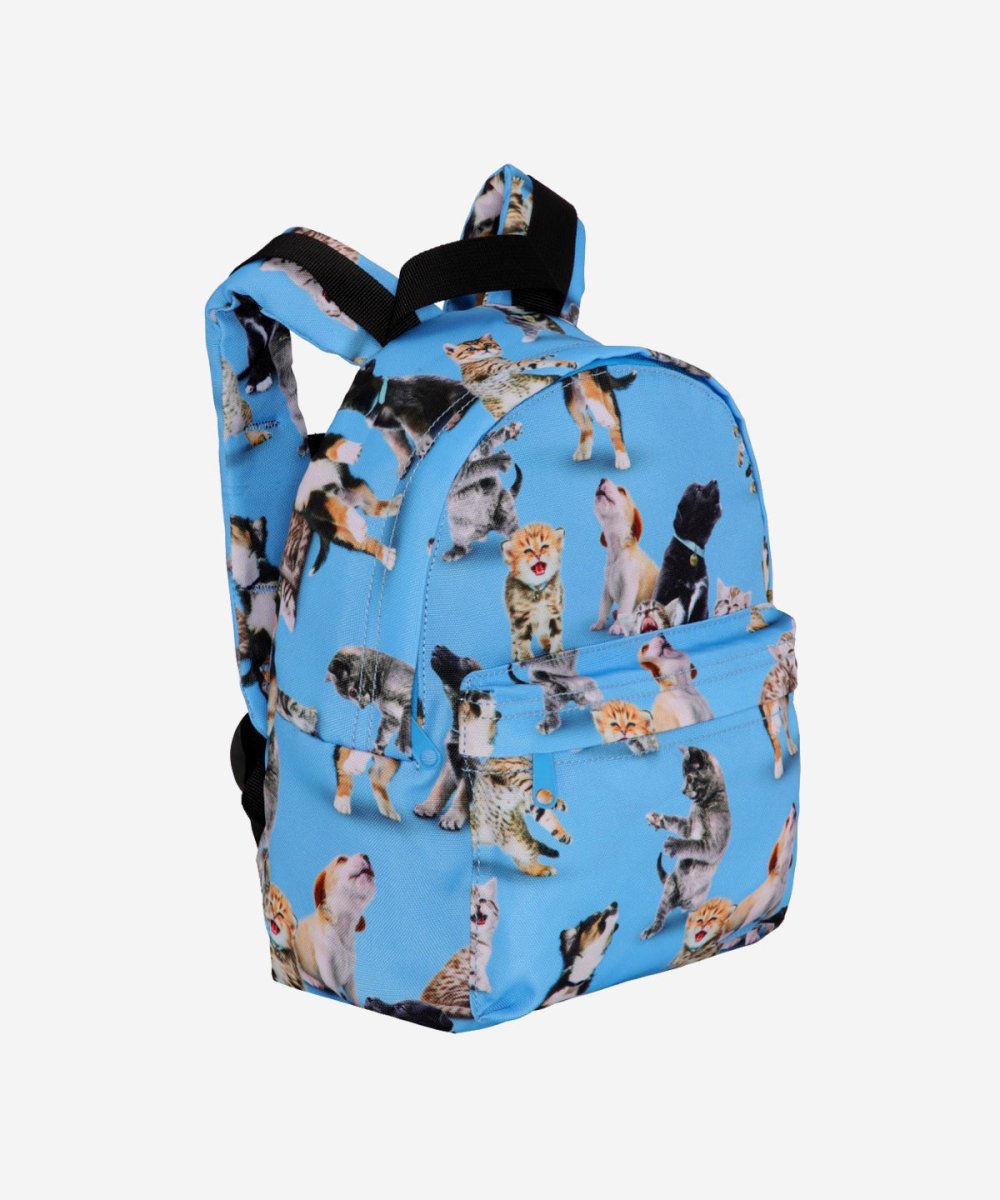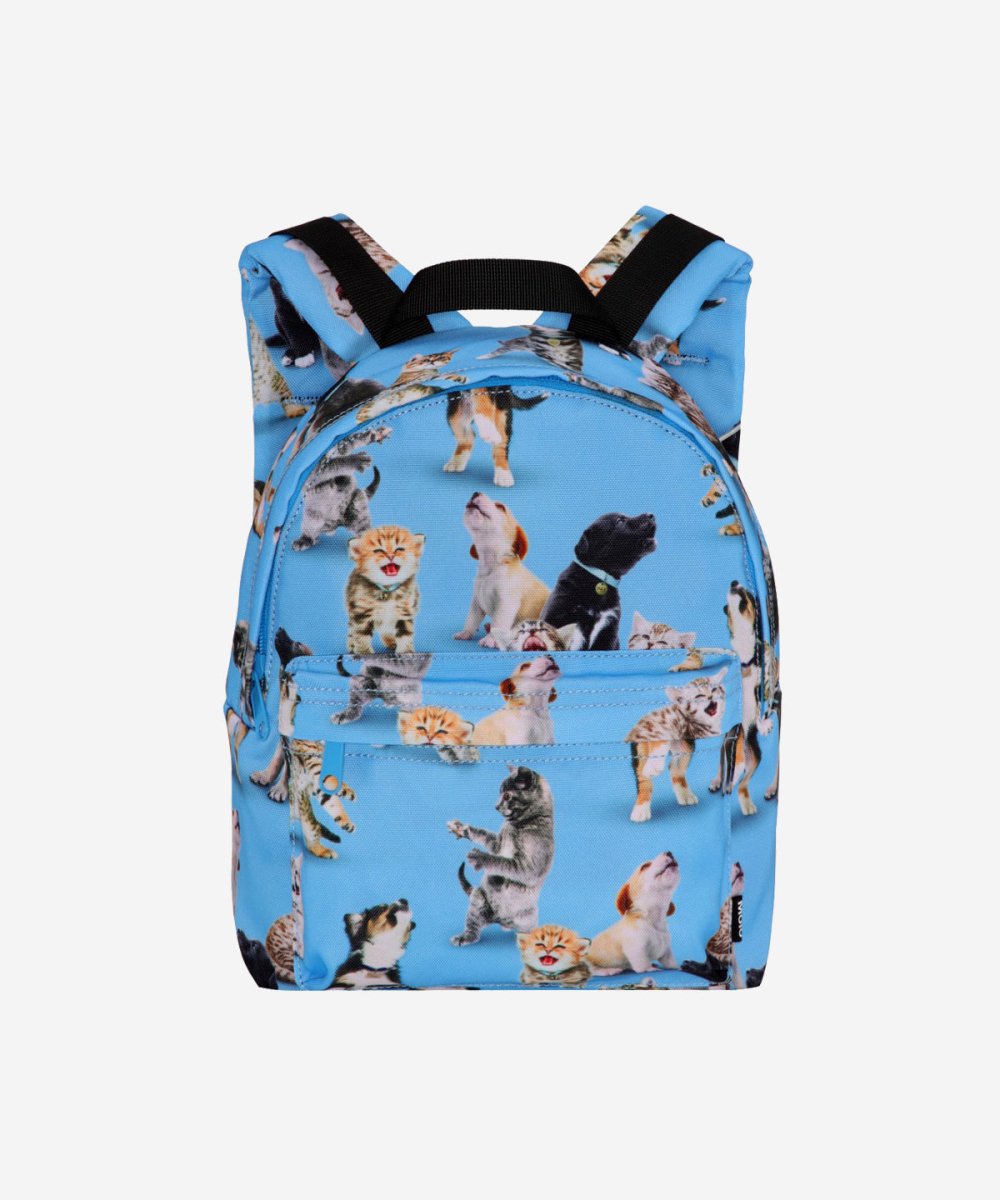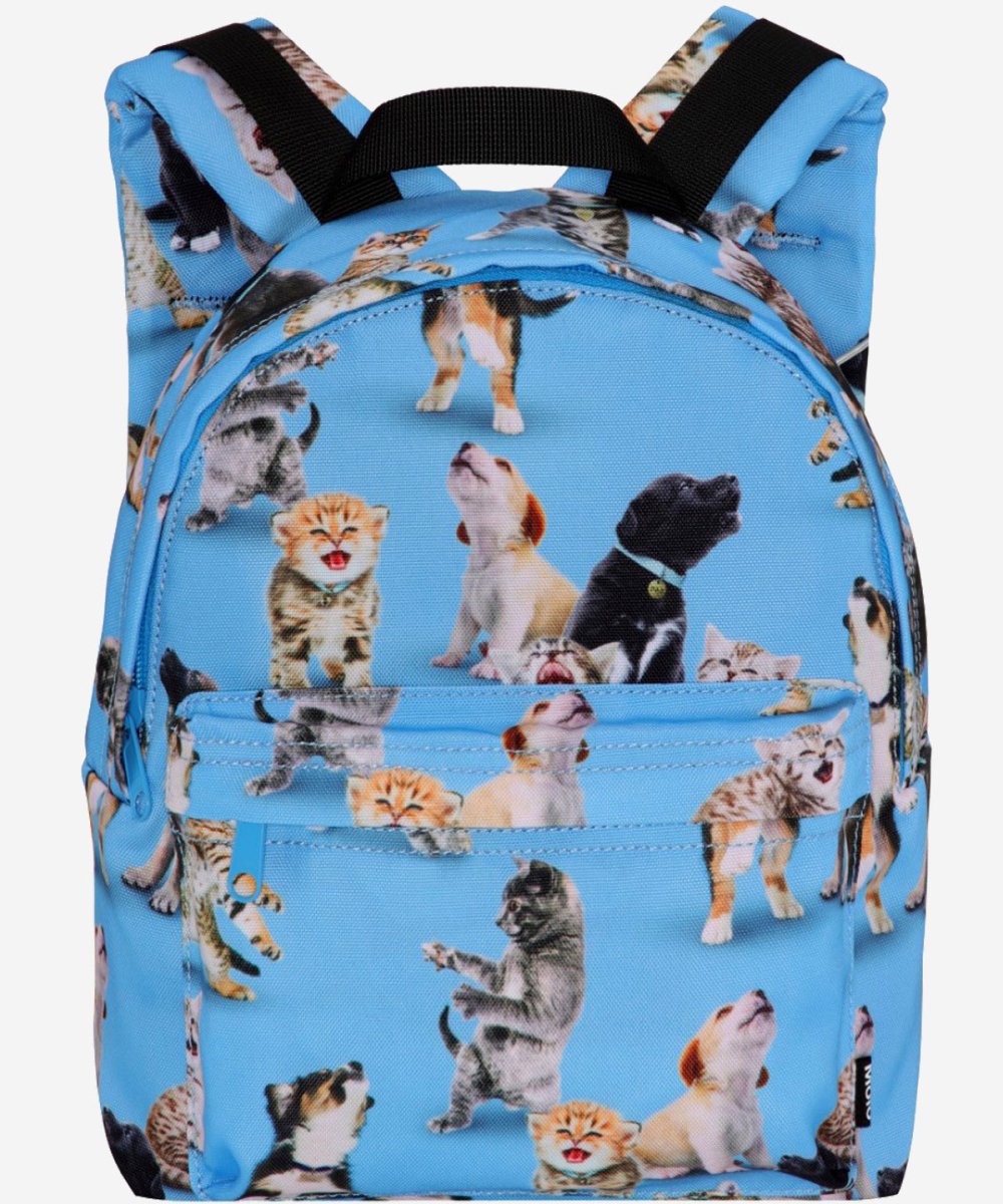 Details: Blue Rucksack with all over print animals. It has an exterior pocket, a buckle on the chest, a loop and adjustable straps. The rucksack measures 25 cm wide and 30 cm tall and is perfect for younger children. This Molo product is recycled and made of reusable polyester that is made of used plastic bottles and other waste. The production of recycled polyester uses much fewer resources and produces less CO2, making Molo’s recycled rucksack the sustainable