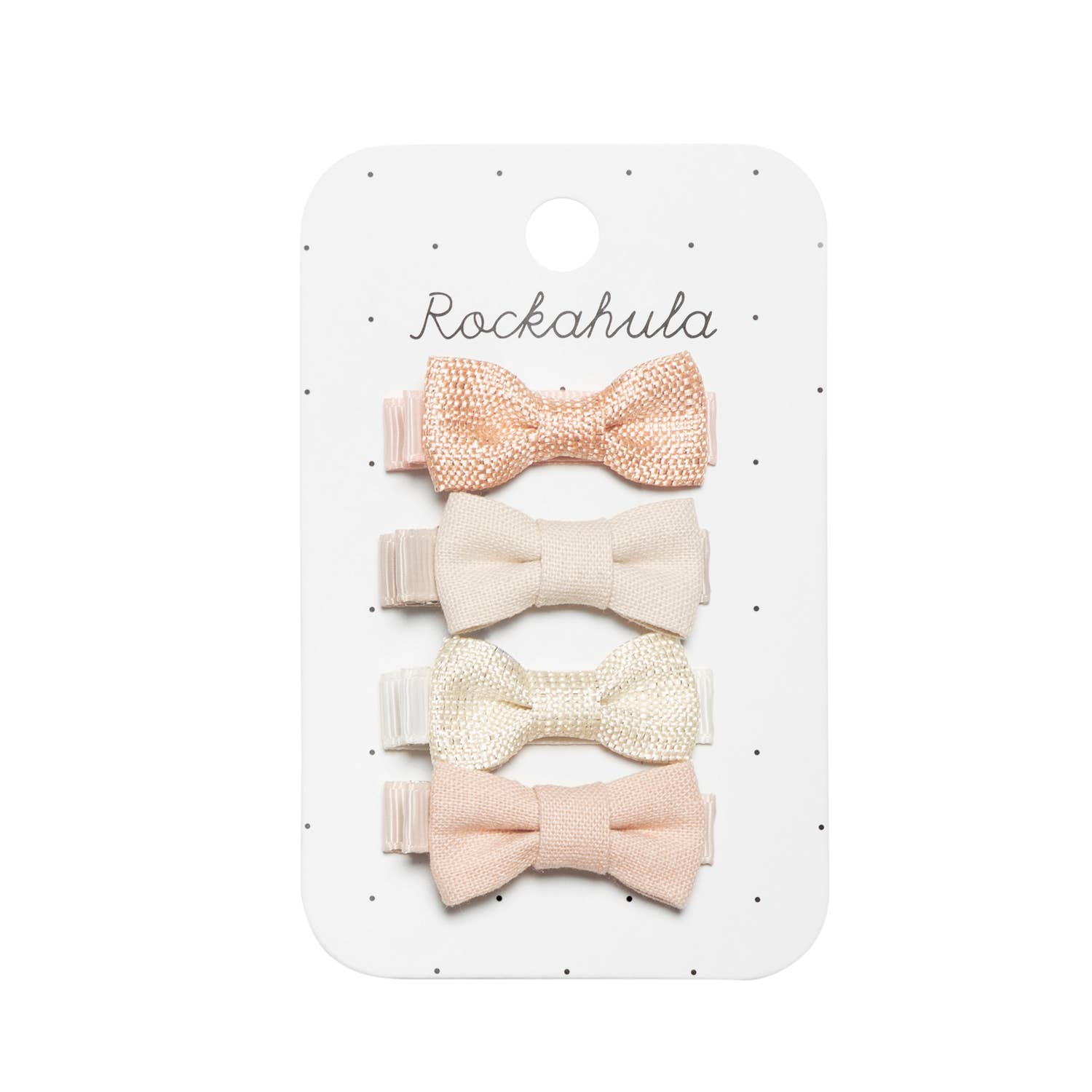 In a palette of soft pink colours, these pretty linen bow clips are designed for a comfortable fit. With four little hand-tied fabric bows, each clip is wrapped in soft grosgrain ribbon. Wear them one at a time, or all together!