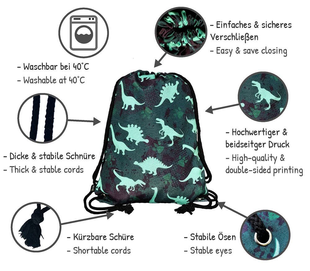 ►COOL DESIGN FOR BOYS: This green/black HECKBO gym bag has a cool boy motif printed on both sides with dinosaurs in bold colors. A must-have for all boys who love dinosaurs!