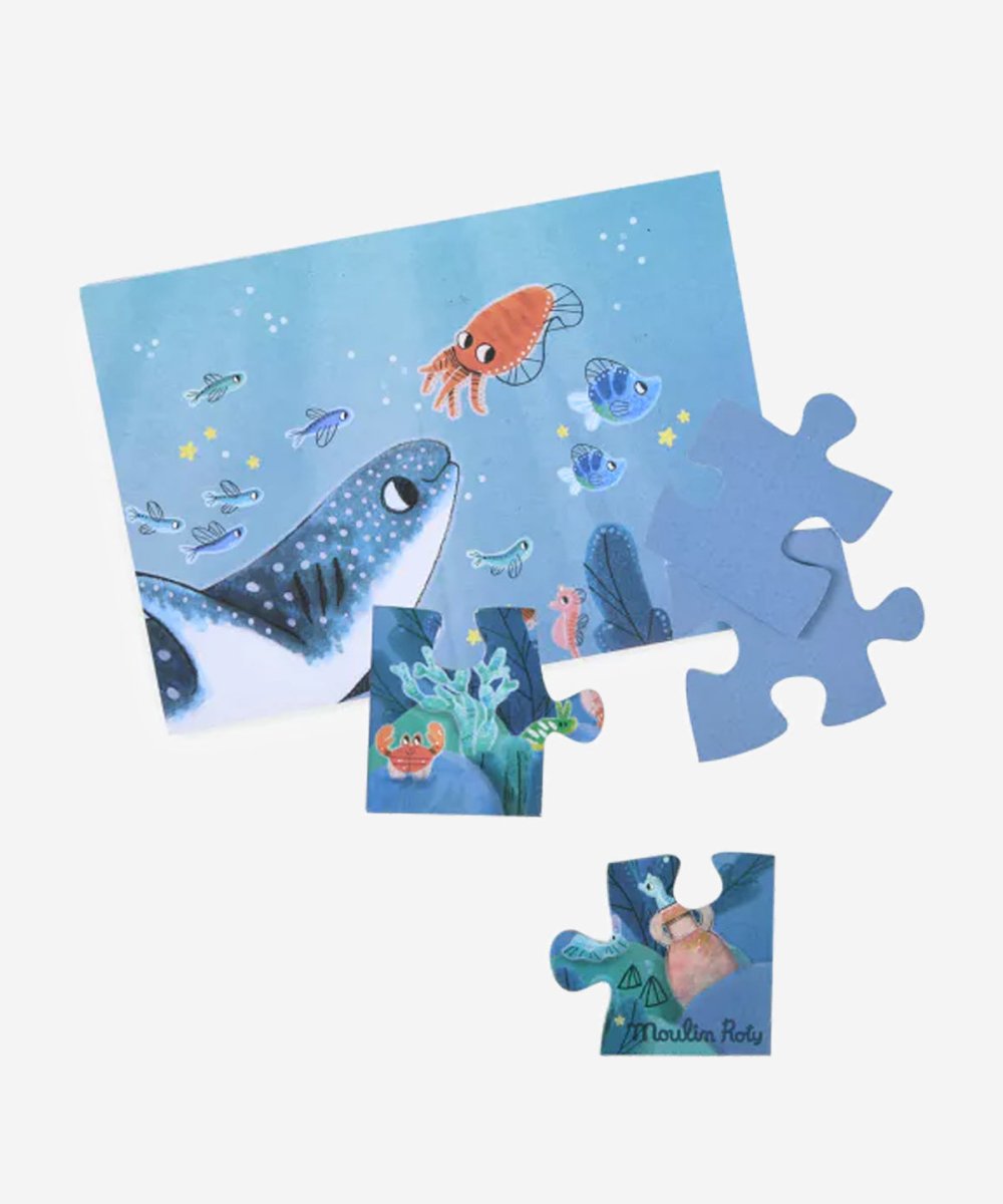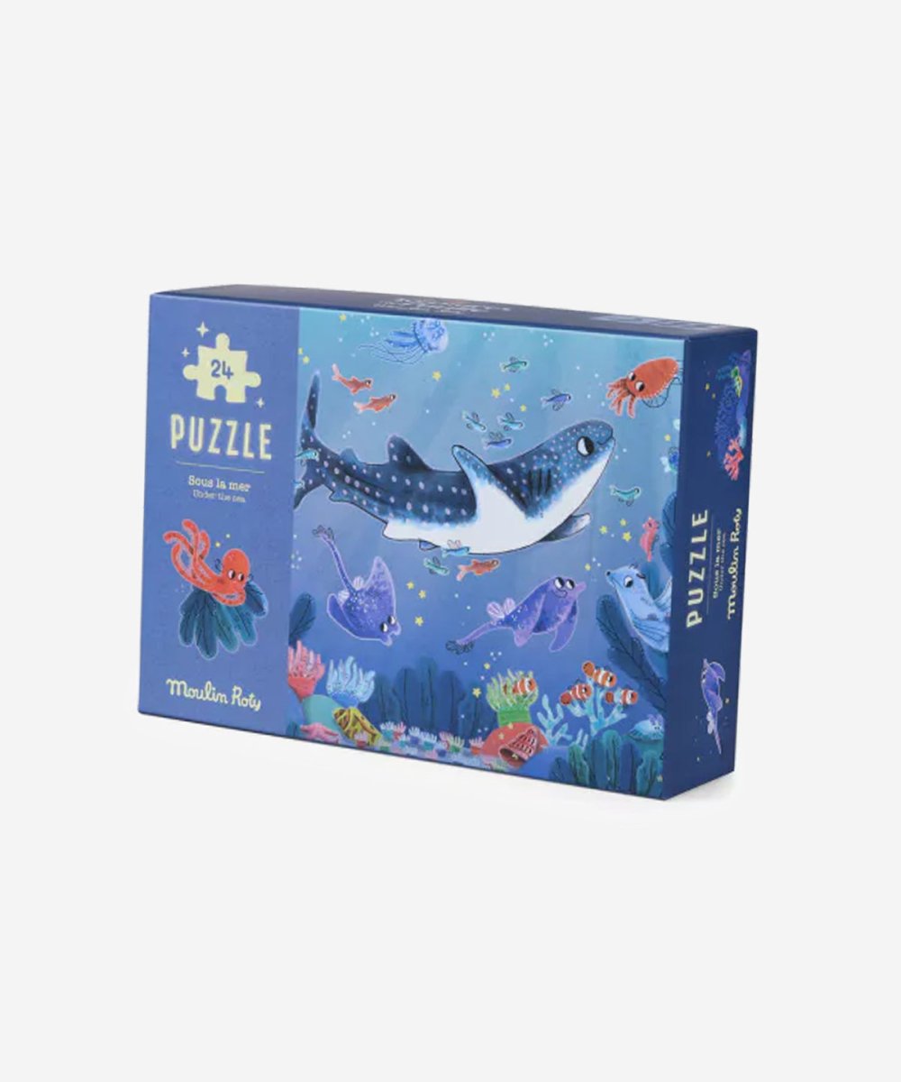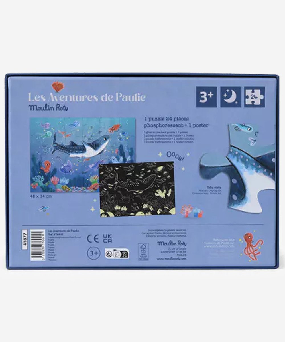 The Moulin Roty Glow-In-The-Dark Puzzle – Under The Sea invites children to explore an enchanting underwater world with a magical night-time twist. After completing the 24-piece puzzle, switch off the lights to reveal glowing sea creatures and hidden ocean details, sparking curiosity and imagination.