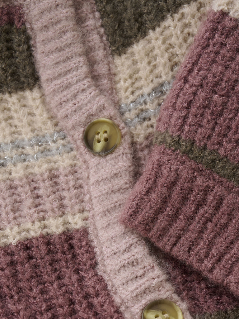The Minymo Girls Cardigan – Woodrose is a soft and versatile knit, perfect for layering on cooler days. Designed in a delicate woodrose pink shade, it adds a charming touch to dresses, tops or everyday outfits.