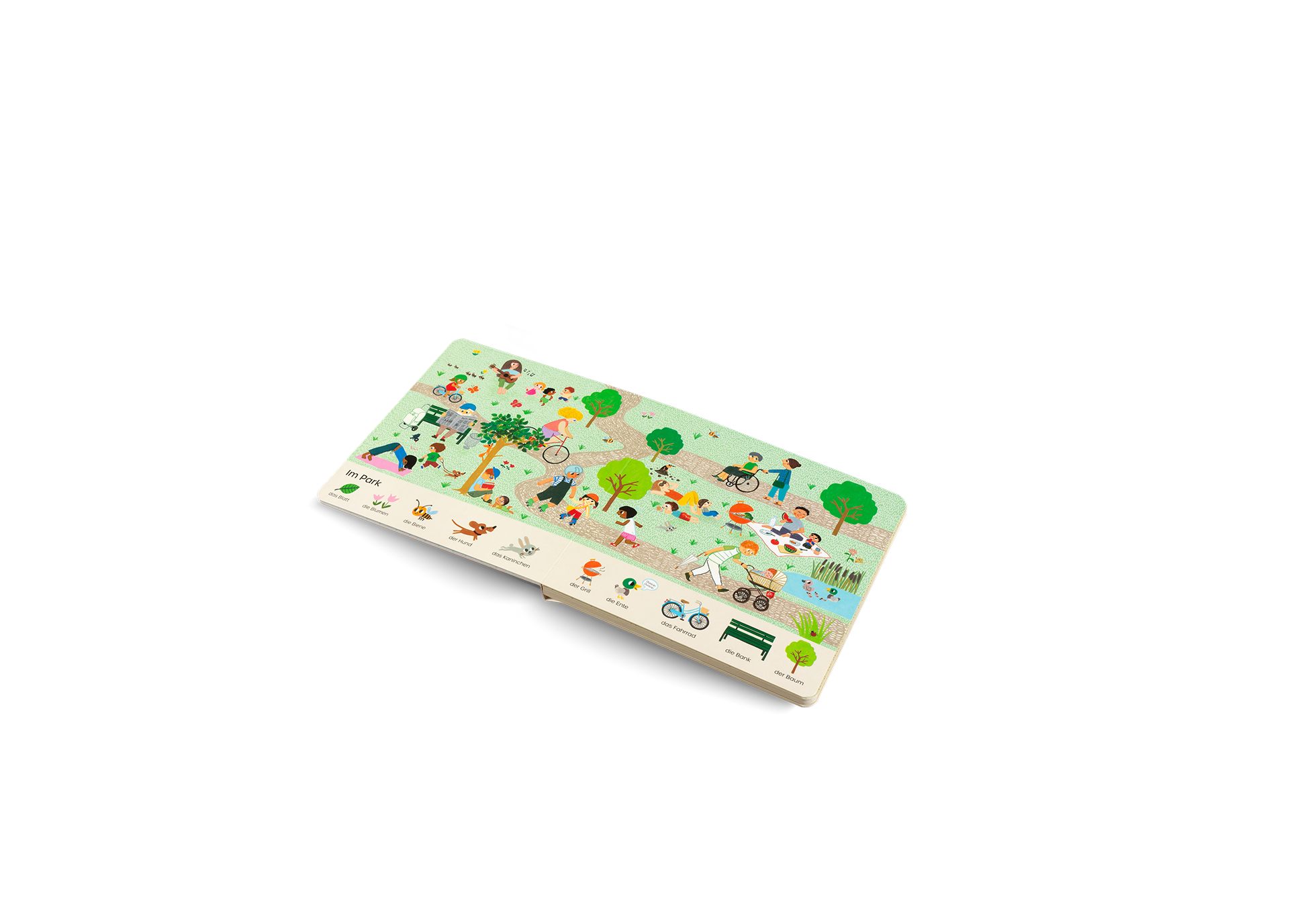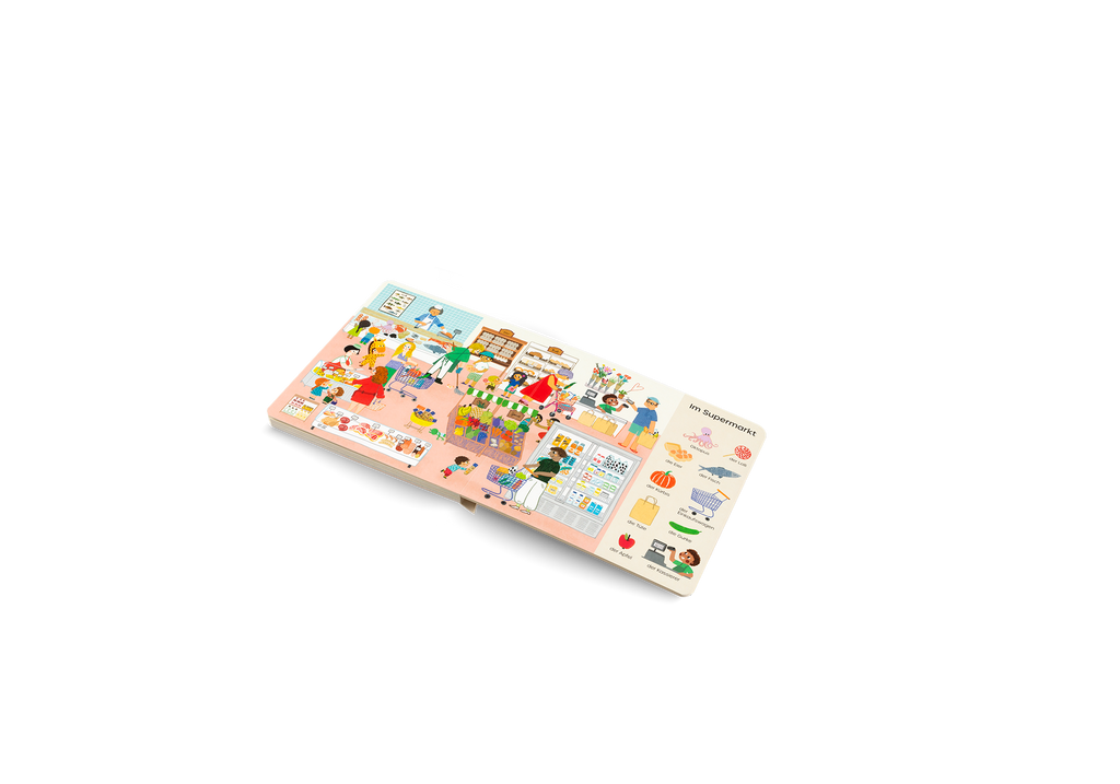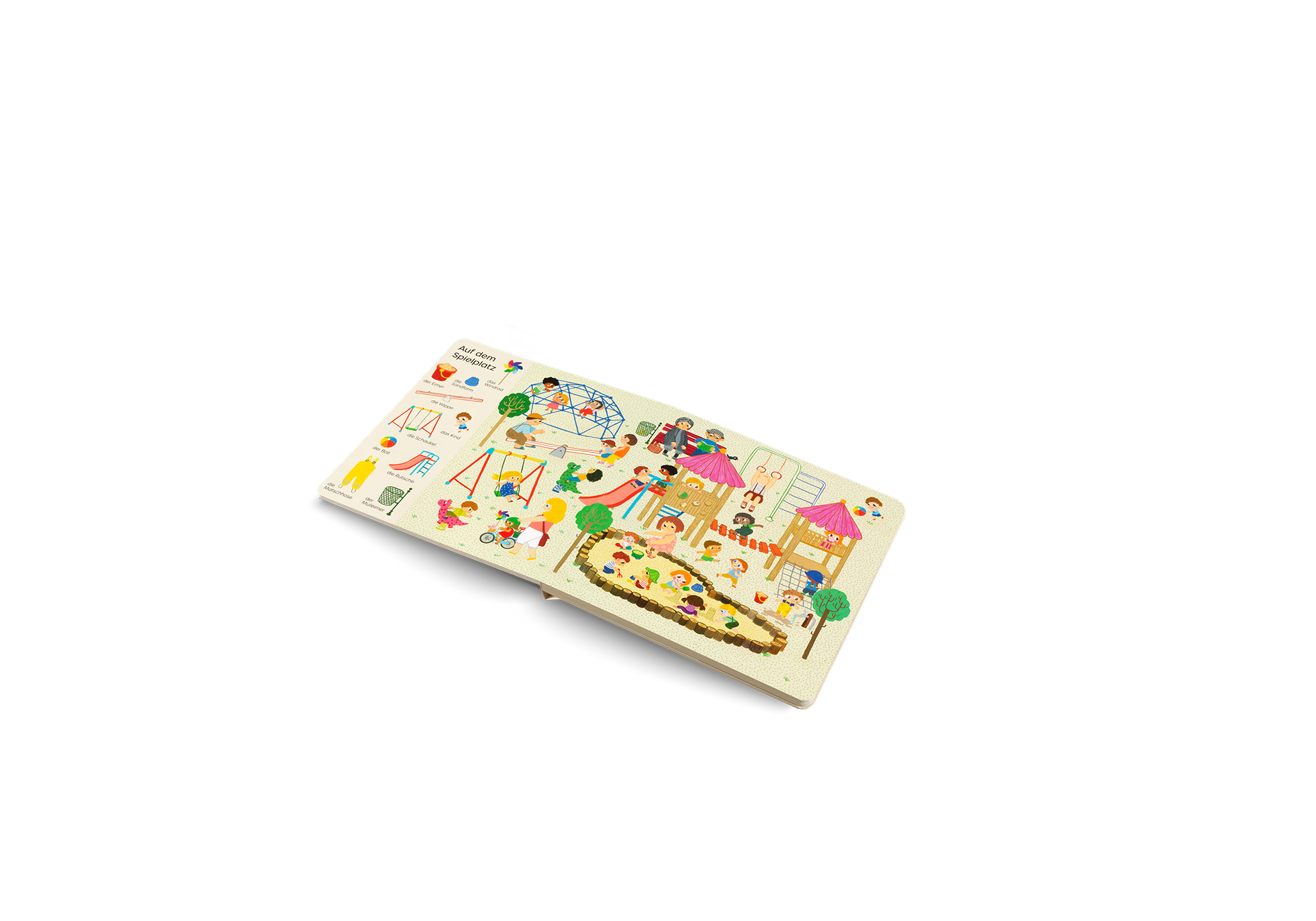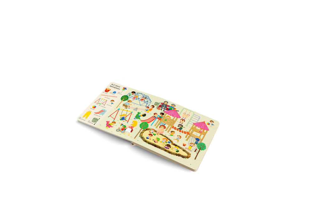 Was steht dort auf dem Esstisch und was ziehe ich heute an? Wem begegne ich auf dem Spielplatz und welche Tiere kenne ich schon im Tierpark? Zuhause, in der Kita oder draußen auf der Straße – überall gibt es so viel zu entdecken. In diesem Buch erkennen Kinder die Gegenstände aus ihrer täglichen Lebenswelt wieder und lernen spielerisch ihre Namen kennen. Farbenfroh illustrierte Szenen im Supermarkt, beim Kinderarzt, im Park oder im Kinderzimmer laden zum Ausdenken eigener Geschichten ein.
