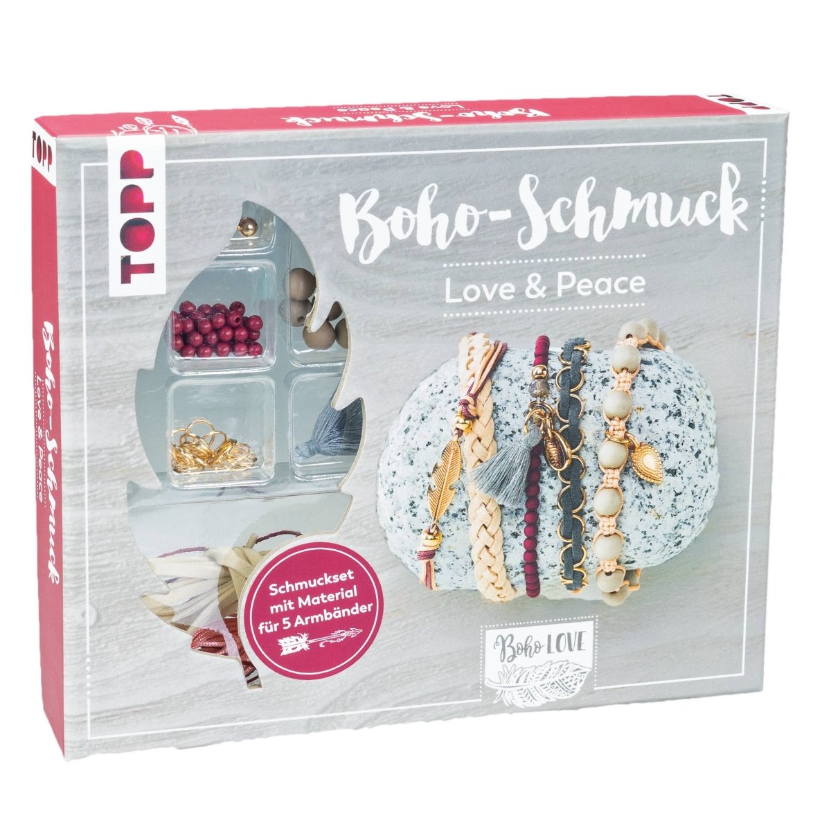 Kreiere mit dem Love & Peace Boho-Schmuckset – Dunkelrot/Grau – farbenfrohe Armbänder im Boho-Stil! Dieses DIY-Set enthält alles, was du benötigst, um fünf einzigartige Boho-Armbänder mit Knoten-, Flecht- und Fädeltechniken herzustellen.