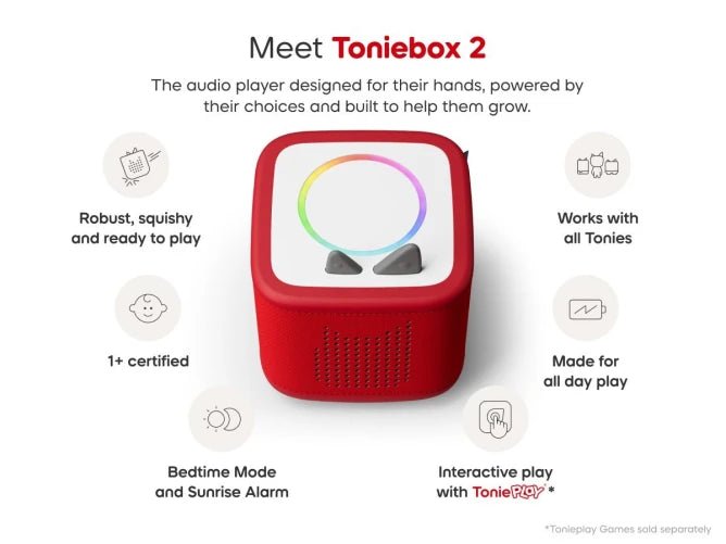 Kinder setzen einfach eine Tonie-Figur auf die Box, um ihre Lieblingslieder und -geschichten zu starten oder interaktive Spiele, Quizze und Herausforderungen im neuen Tonieplay- Modus zu entdecken. Clevere Schlafenszeitfunktionen helfen dabei, gesunde Schlafgewohnheiten zu entwickeln und machen das Spiel somit perfekt für tagsüber und abends zum Entspannen.
