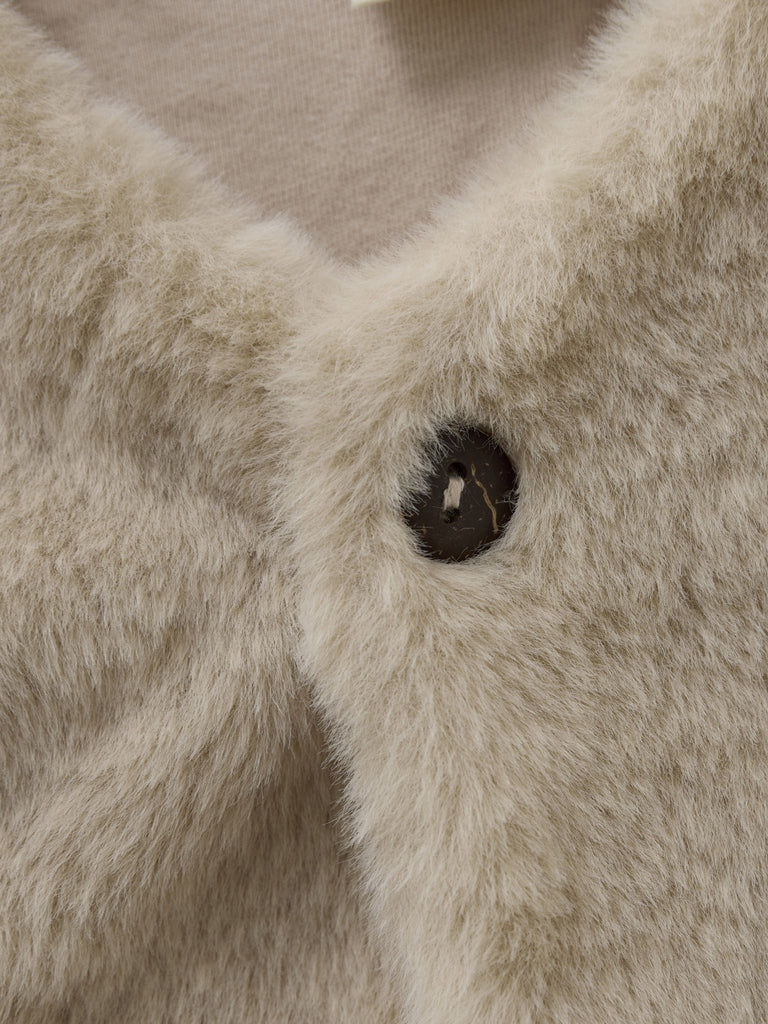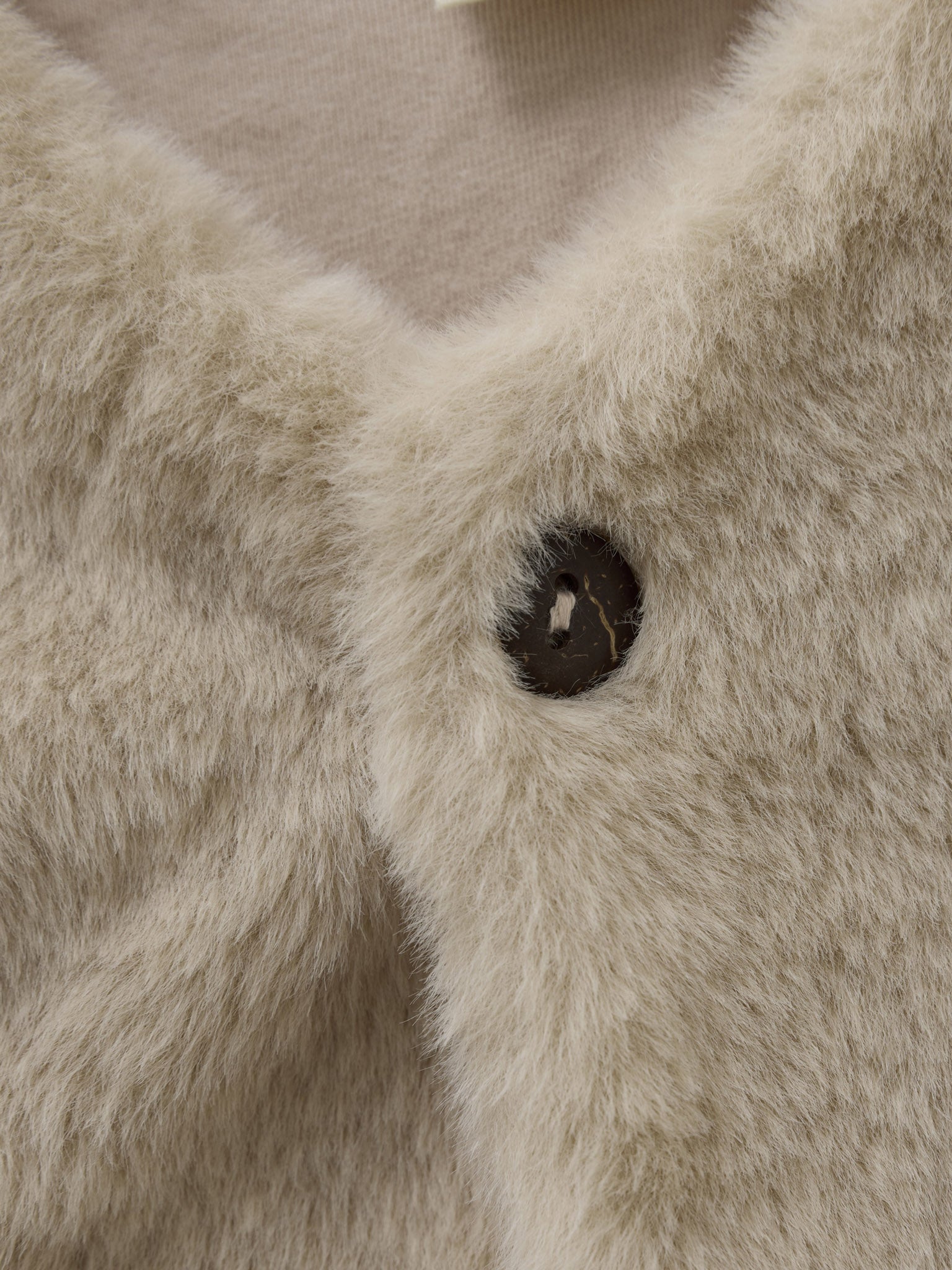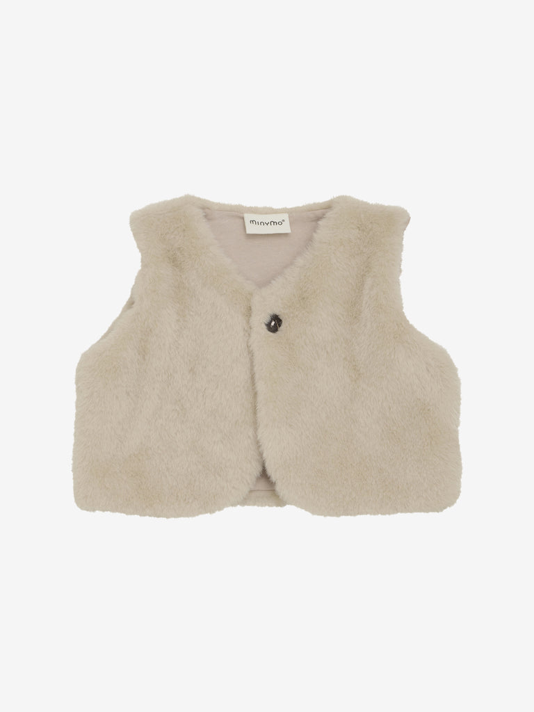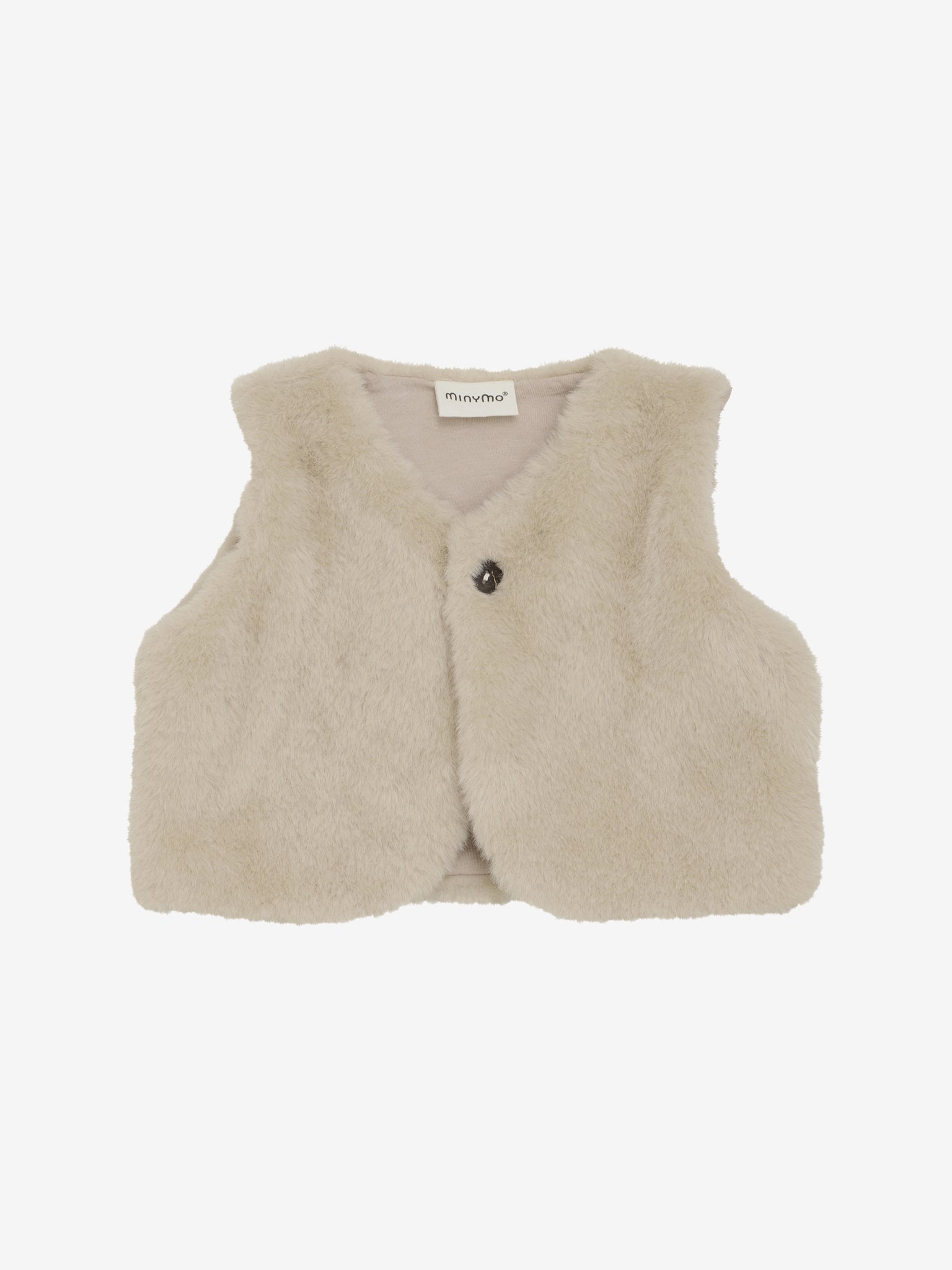The Minymo Baby Girls Vest – Fake Fur Smoke Gray is a cosy and stylish layer for cooler days. Designed in a chic smoke gray shade, this adorable faux-fur vest adds warmth and texture to any outfit – perfect over dresses, tops or long sleeves.